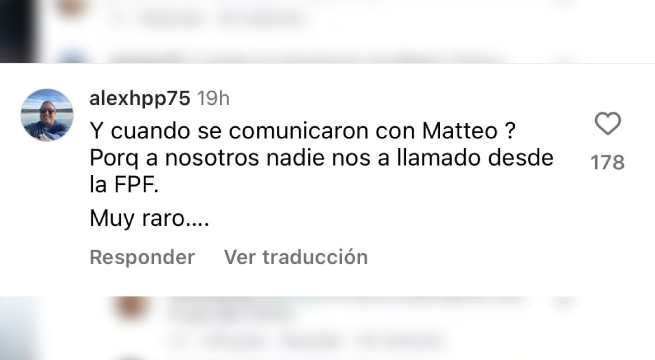 “¿Y cuándo se comunicaron con Matteo? Porque a nosotros nadie nos a llamado desde la FPF. Muy raro”, escribió Alex Pérez en una página de instagram.