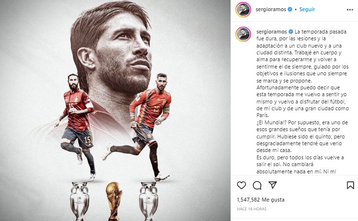 Sergio Ramos aseguró que será uno más animando al equipo español desde su casa. “¿El Mundial? Por supuesto, era uno de esos grandes sueños que tenía por cumplir. Hubiese sido el quinto, pero desgraciadamente tendré que verlo desde mi casa”, comentó en la primera parte de su publicación en redes sociales.