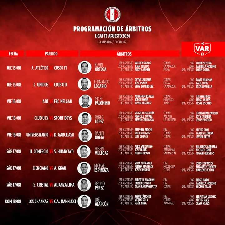 Ante ello, la Comisión Nacional de Árbitros (Conar) definió a los jueces encargados de impartir justicia en la séptima fecha del Torneo Clausura en donde Bruno Pérez es el elegido de arbitrar el duelo entre ‘cerveceros’ y ‘blanquiazules’ en el estadio Nacional.