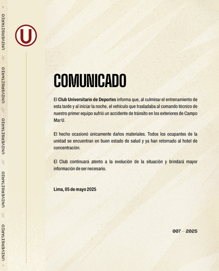 “El Club Universitario de Deportes informa que, al culminar el entrenamiento de esta tarde y al iniciar la noche, el vehículo que trasladaba al comando técnico de nuestro primer equipo sufrió un accidente de tránsito en los exteriores de Campo Mar U”, se lee en la primera parte del comunicado.
