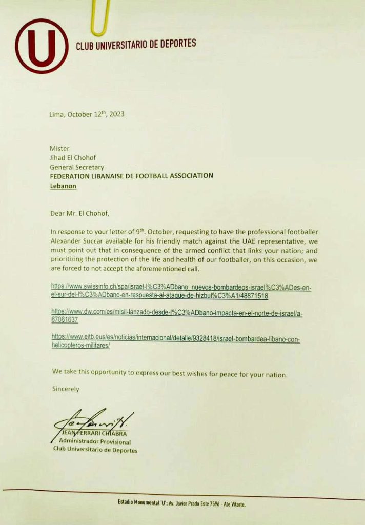 “La Asociación Libanesa de Fútbol envió el pasado lunes una carta a Universitario solicitando la incorporación de Alexander Succar a la selección y así disputar un amistoso con la selección de Emiratos, el próximo martes en el estadio Al Maktoum. Sin embargo, ellos rechazan la solicitud debido al conflicto armado y porque tienen como prioridad proteger al jugador“, indica parte del comunicado.