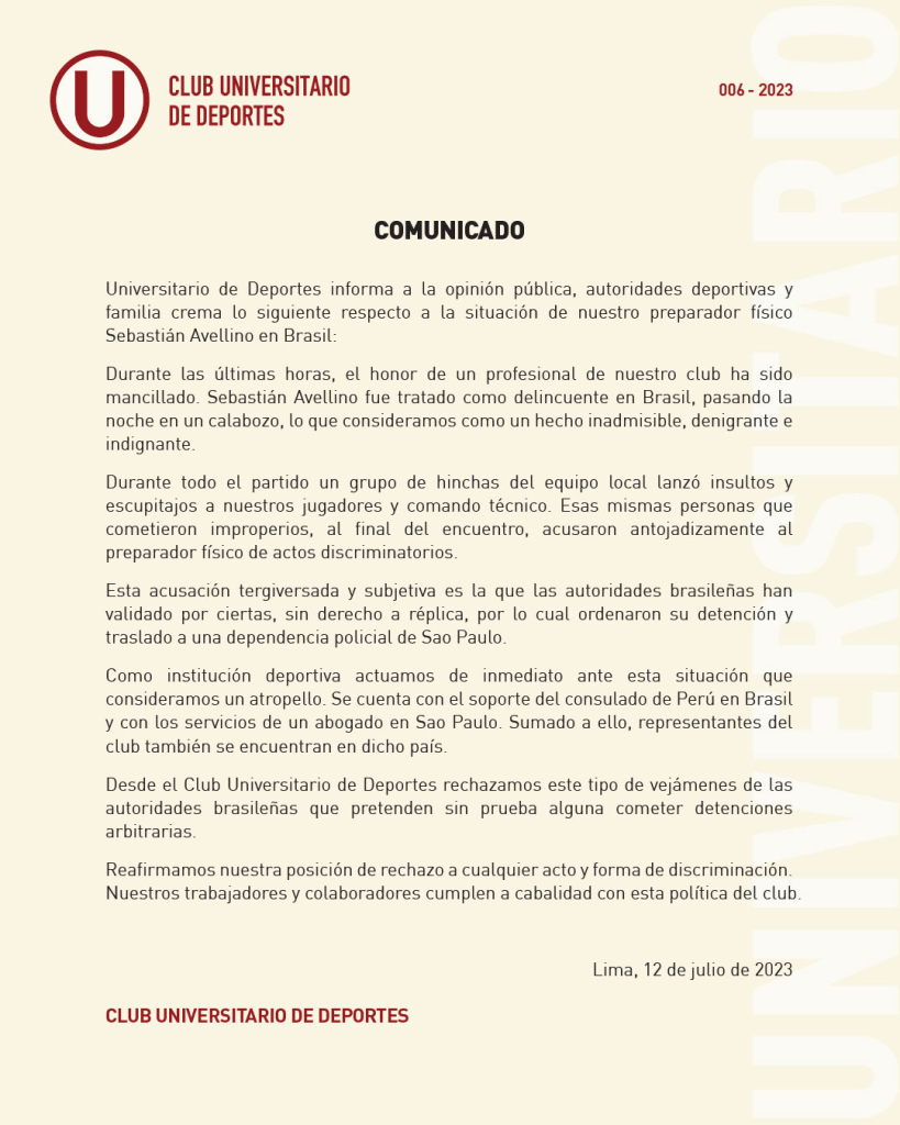 Mediante un comunicado, Universitario de Deportes afirmó que Avellino “fue tratado como un delincuente”, lo que consideraron como “un hecho inadmisible, denigrante e indignante”. Además, acusaron a los fanáticos del cuadro brasileño de provocar a la banca visitante.