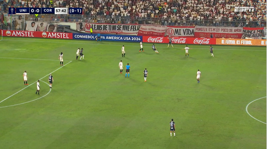 - 7′ – La visita intenta desbordar por la banda izquierda de Universitario. Anteriormente, tuvieron una opción de gol a través de un tiro libre