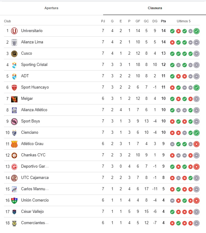 ¿Cómo quedó la tabla de Liga 1 tras la fecha 7 del Torneo Clausura?