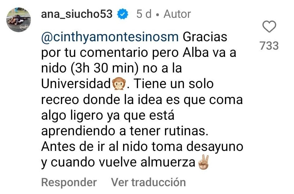 Ante estas críticas, Ana Siucho no se quedó en silencio y decidió responder con contundencia. “Gracias por tu comentario, pero Alba va a nido (3h 30 min) no a la Universidad. Tiene un solo recreo, donde la idea es que coma algo ligero, ya que está aprendiendo a tener rutinas. Antes de ir al nido toma desayuno y cuando vuelve almuerza”, fue la respuesta directa de Siucho a una usuaria que cuestionó la composición de la lonchera.