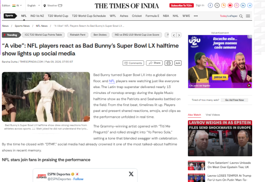 The Times of India (“Una vibra”: jugadores de la NFL reaccionan mientras el show de medio tiempo de Bad Bunny en el Super Bowl LX enciende las redes sociales)