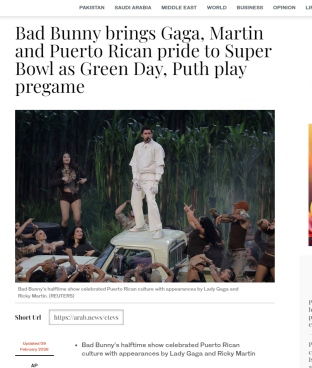 Arab News (Bad Bunny lleva a Gaga, Martin y el orgullo puertorriqueño al Super Bowl mientras Green Day y Puth juegan antes del partido)