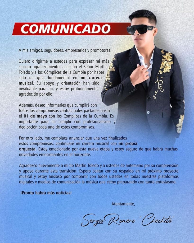 En un comunicado oficial, el cantante no dudó en mostrar su gratitud a su tío y fundador de Los Cómplices de la Cumbia: Martín Toledo. Además, señaló que se lanzará como solista.