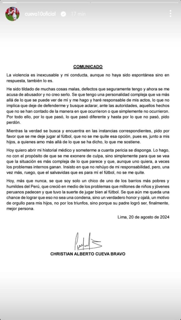 Por medio de su cuenta oficial de Instagram, el popular “Aladino” no solo indicó que buscará defenderse y aclarar las acusaciones en su contra, sino también pidió que, mientras se busca la verdad, lo dejen jugar al fútbol.