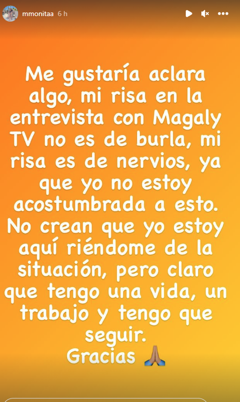 “Me gustaría aclarar algo, mi risa en la entrevista con Magaly TV no es de burla, mi risa es de nervios, ya que no estoy acostumbrada a esto. No crean que yo estoy aquí riéndome de la situación, pero claro que tengo una vida, un trabajo y tengo que seguir. Gracias” sentenció.