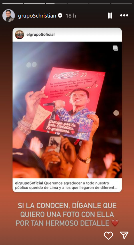 En su storie de Instagram, el cantante Christian Yaipén captó la atención luego que compartiera una fotografía donde se ve la dedicatoria que le hizo una de sus seguidoras que asistió a uno de los conciertos que Grupo 5 ofreció en el Estadio Nacional.