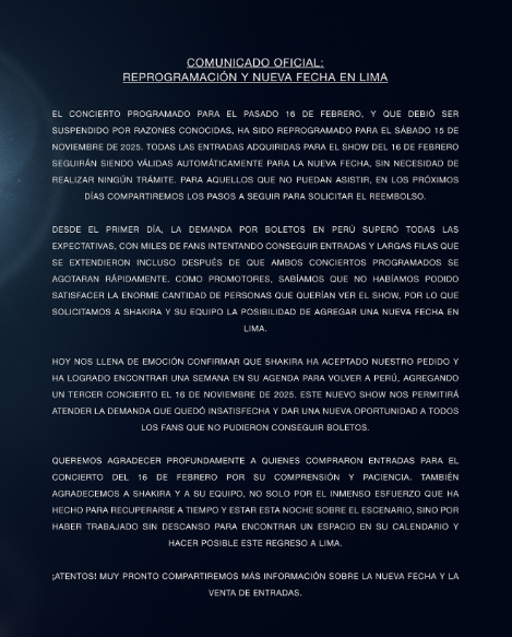 Si bien un concierto de Shakira fue cancelado, ahora se ha confirmado que habrá una nueva fecha el domingo 16 de noviembre. “Hoy nos llena de emoción confirmar que Shakira ha aceptado nuestro pedido y ha logrado encontrar una semana en su agenda para volver a Perú, agregando un tercer concierto el 16 de noviembre”, indicaron.