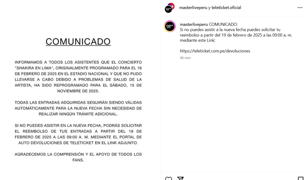 “Informamos a todos los asistentes que el concierto de Shakira en Lima, originalmente programado para el 16 de febrero de 2025 en el Estadio Nacional y que no pudo llevarse a cabo debido a problemas de salud de la artista, ha sido programado para el sábado 15 de noviembre de 2025. Todas las entradas adquiridas seguirán siendo válidas automáticamente para la nueva fecha, sin necesidad de realizar ningún trámite adicional”, detallaron.