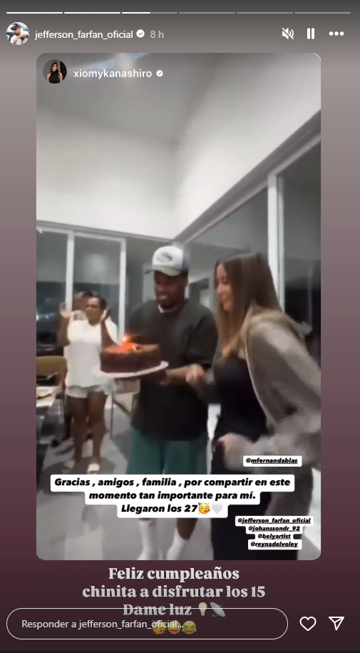 Asimismo, Jefferson Farfán compartió el video y agregó un curioso saludo a la modelo. “Feliz cumpleaños chinita, a disfrutar los 15. Dame luz”, escribió la ‘Foquita’.