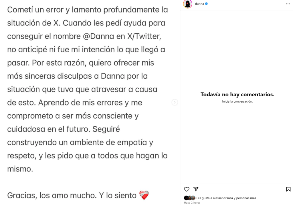 “Cometí un error y lamento profundamente la situación de X. Cuando les pedí ayuda para conseguir el nombre @Danna en X/Twitter, no anticipé ni fue mi intención lo que llegó a pasar. Por esta razón, quiero ofrecer mis más sinceras disculpas a Danna por la situación que tuvo que atravesar a causa de esto. Aprendo de mis errores y me comprometo a ser más consciente y cuidadosa en el futuro. Seguiré construyendo un ambiente de empatía y respeto, y les pido que a todos que hagan lo mismo”, escribió la cantante en la publicación que hizo en Instagram.