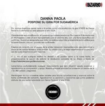 Malas noticias para los fanáticos de Danna Paola. Bizarro Live Entertainment Perú, empresa productora encargada de gestionar la realización del concierto en Perú, informó que debido a motivos logísticos ajenos a la intérprete y producción se pospuso la gira por Sudamérica hasta 2024.