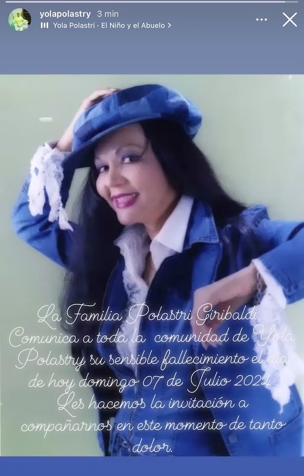 “La familia Polastri Giribaldi comunica a toda la comunidad de Yola Polastri su sensible fallecimiento el día de hoy domingo 7 de julio 2024. Le hacemos la invitación a acompañarnos en este momento de tanto dolor”, se lee en el comunicado publicado en su cuenta de Instagram.