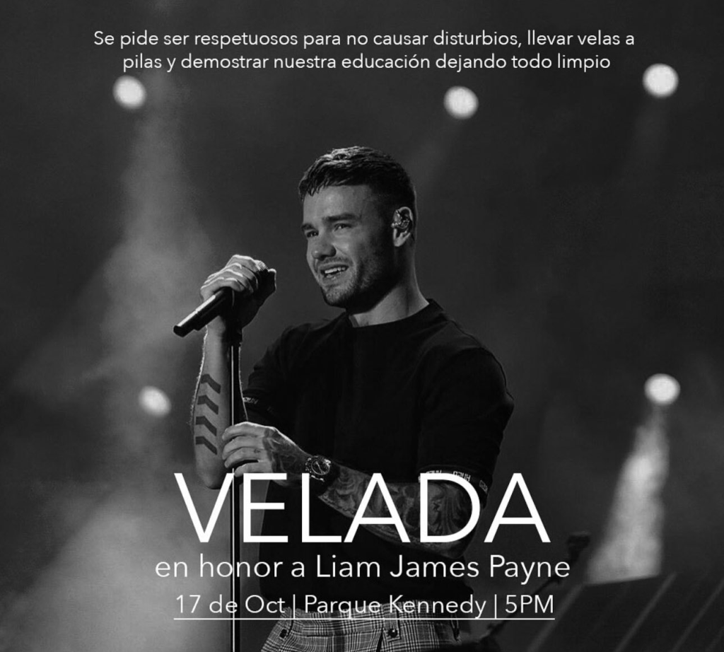 “Velada en honor a Liam James Payne el día 17 de octubre en el parque Kennedy a las 5 de la tarde”, se lee en la imagen que ha sido difundida en redes sociales por diversos personajes. Asimismo, las fanáticas pidieron ser respetuosas, ordenadas y limpias en la zona.
