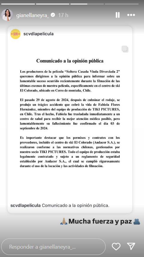 Hasta el momento, se desconoce detalles de cómo ocurrió el trágico accidente o sobre los responsables; sin embargo, Gianella Neyra protagonista de la cinta, dejó un corto mensaje en sus redes sociales.