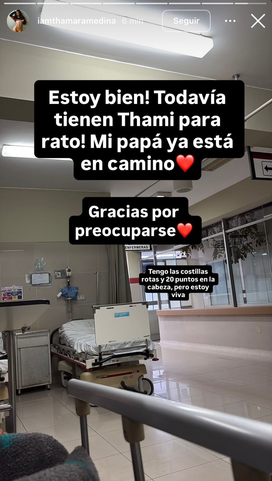 “Tengo las costillas rotas y 20 puntos en la cabeza pero estoy viva”, agregó la joven en donde agregó una foto del hospital donde fue atendida. Con este mensaje, Medina calmó a sus miles de seguidores quienes no sabían sobre su estado de salud.