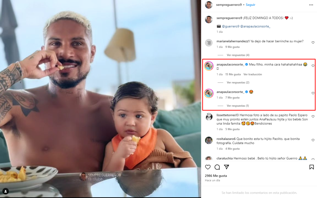Tras su llegada a Brasil, Paolo Guerrero tomó una foto con su hijo y Ana Paula Consorte soltó un curioso comentario en la red social. “mi hijo, mi cara, jajaja”, escribió la modelo brasileña en Instagram. Si bien algunos de los usuarios le respondieron, ella siguió comentando la publicación.