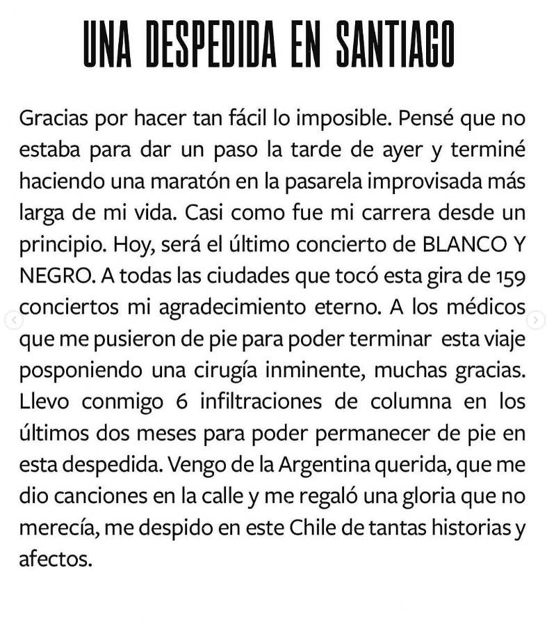 “(…) Pensé que no estaba para dar un paso la tarde de ayer y terminé haciendo una maratón en la pasarela improvisada más larga de mi vida (…) A los médicos que me pusieron de pie para poder terminar este viaje posponiendo una cirugía inminente, muchas gracias. Llevo conmigo infiltraciones de columna en los últimos dos meses para poder permanecer de pie en esta despedida”, comunicó el cantante.