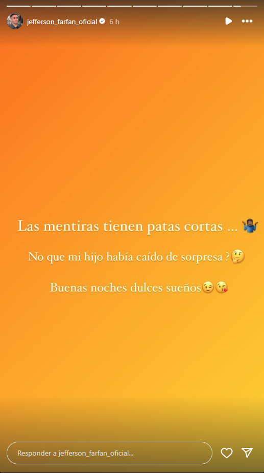 Y en su último storie, dice: “Las mentiras tienen patas cortas… ¿No que mi hijo había caído de sorpresa? Buenas noches, dulces sueños”.