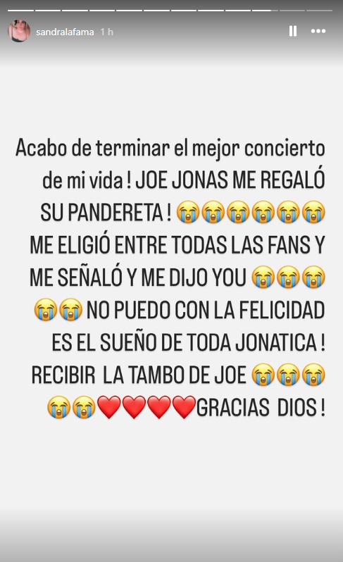 “Acabo de terminar el mejor concierto de mi vida. Joe Jonas me regaló su pandereta,me eligió entre todas las fans y me señaló y me dijo you, no puedo con la felicidad es el sueño de tona Jonatica, recibir la tambo de Joe, gracias Dios”, escribió la fan muy emocionada.