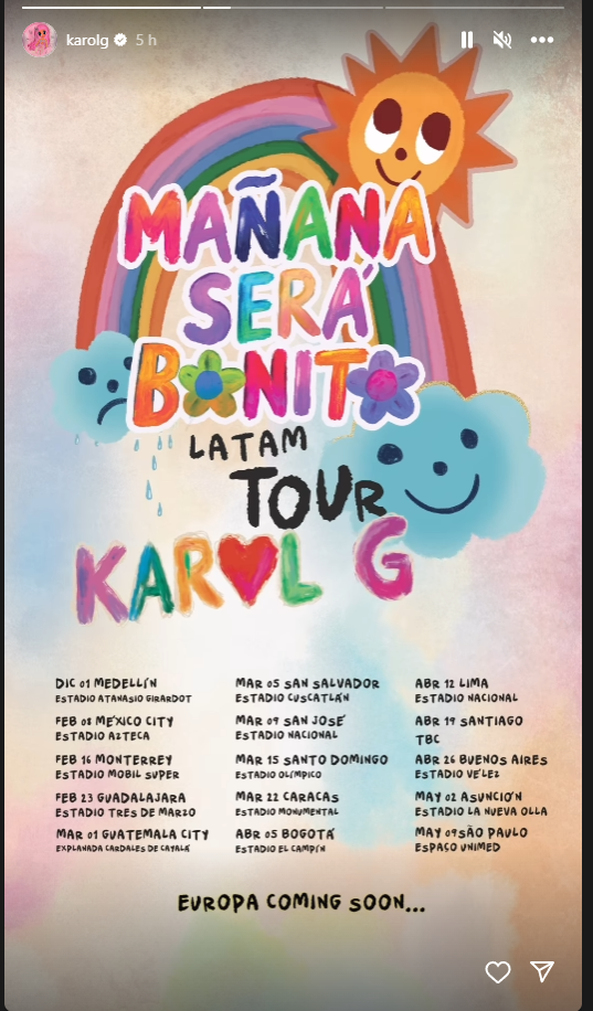 Según la publicación compartida por la ‘bichota’, también llegará a los siguientes países: México, Guatemala, El Salvador, Costa Rica, Venezuela, Colombia, Chile, Argentina, Paraguay y Brasil.