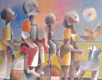Olmedo Quimbita nuevamente, con sus trazos, ha aplicado las técnicas por las cuales ha ganado reconocimiento. “Pinto la luz andina y la luz tropical. Pinto el mundo que me ha rodeado… Y siempre con un profundo optimismo, retratanto la belleza de la familia, de los niños, de las madres… Del universo”.