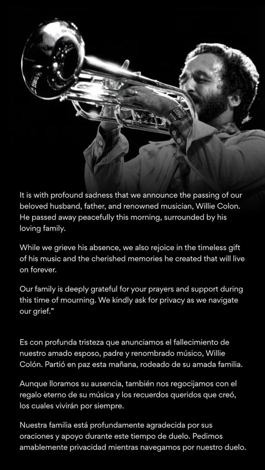 La noticia fue confirmada por su familia mediante un comunicado difundido en las redes sociales oficiales del músico. “Es con profunda tristeza que anunciamos el fallecimiento de nuestro amado esposo, padre y renombrado músico, Willie Colón. Partió en paz esta mañana, rodeado de su amada familia”, se lee en el comunicado.