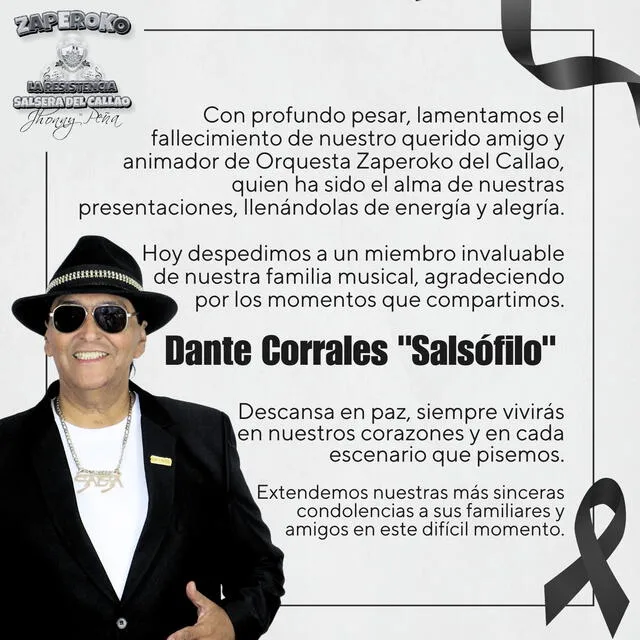 Tristeza total para muchos fanáticos de la salsa. A través de sus redes sociales, la orquesta musical Zaperoko informó y lamentó el fallecimiento de Dante “Salsófilo” Corrales, animador de la famosa agrupación del Callao.