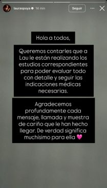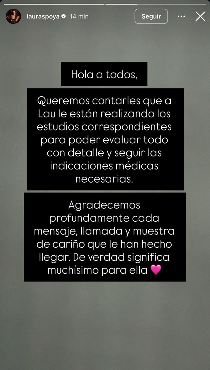 Además, se señala que los médicos están revisando cada detalle para determinar el tratamiento adecuado, mientras Laura permanece bajo observación. Asimismo, se agradeció profundamente las muestras de apoyo recibidas en las últimas hora.