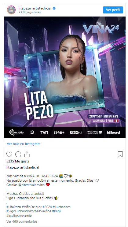 La joven artista Lita Pezo ha sido seleccionada para representar al Perú en la competencia internacional del prestigioso Festival de Viña del Mar 2024. A medida que se acerca la fecha del festival, se intensifica la expectativa por escuchar las interpretaciones de quienes competirán por el codiciado galardón.