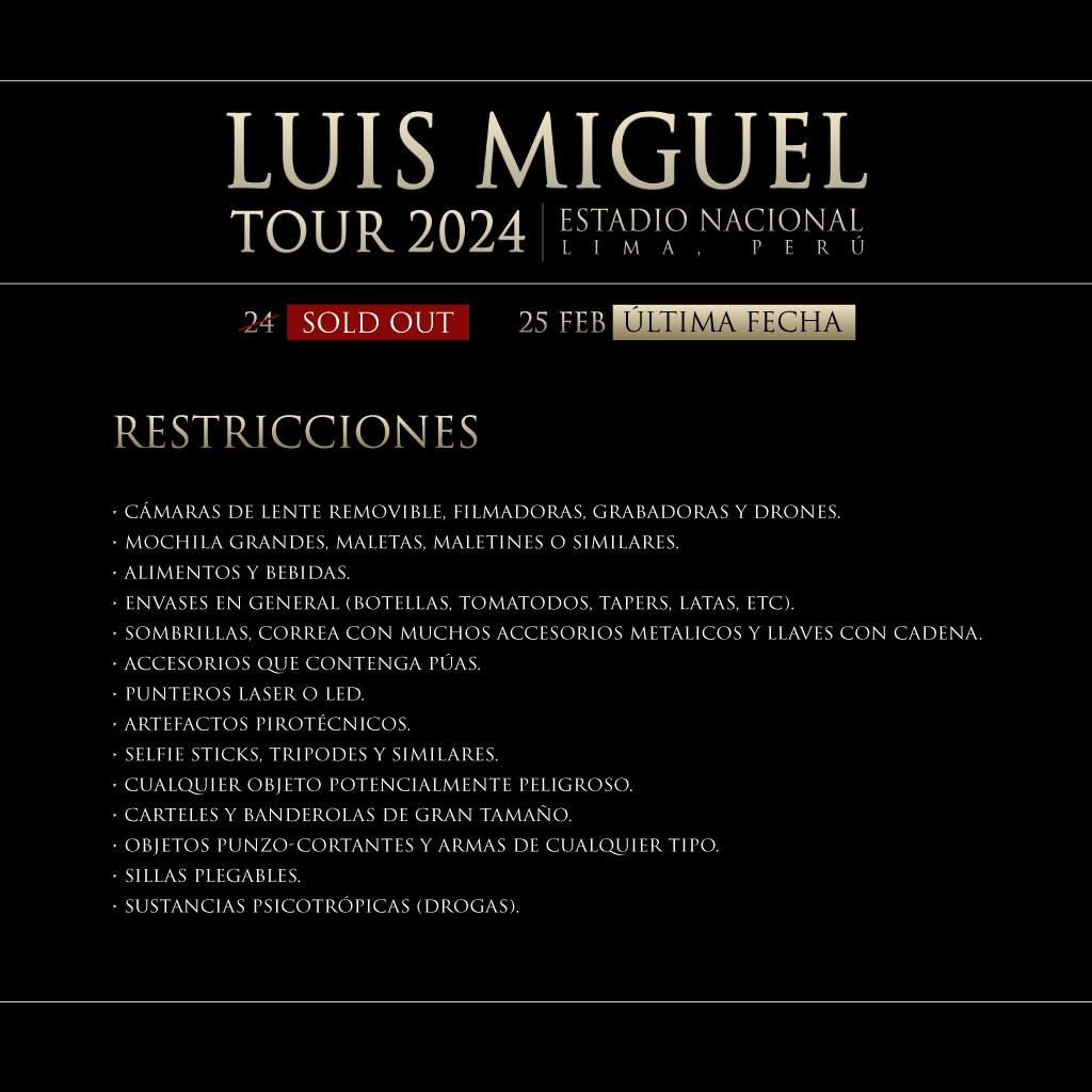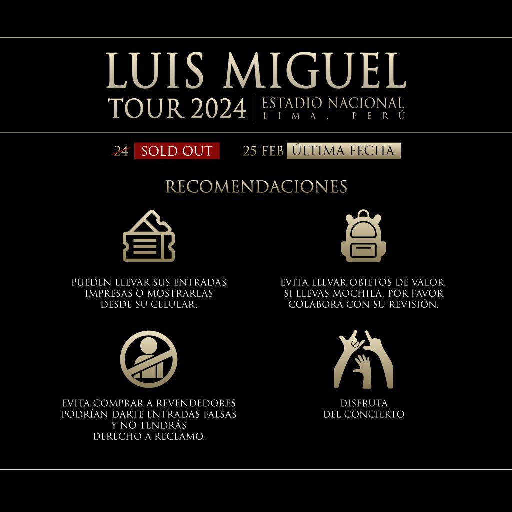 Luis Miguel llegó a Lima el último 22 de febrero en compañía de 10 miembros de su equipo, incluyendo a su hija Michelle Salas. El resto de su equipo, conformado por 120 personas, arribó horas después. Su presencia ha generado gran expectativa, evidenciado por el sold out en su primera fecha, el 24 de febrero, lo que llevó a la apertura de una segunda fecha.