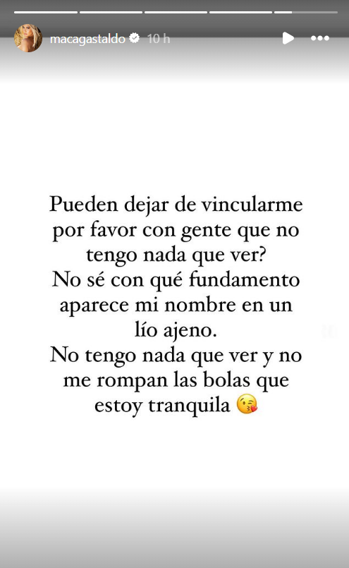 “Pueden dejar de vincularme, por favor, con gente que no tengo nada que ver. No sé con qué fundamento aparece mi nombre en un lío ajeno. No tengo nada que ver y no me rompan las bolas que estoy tranquila”, escribió la exchica reality en su storie de Instagram.