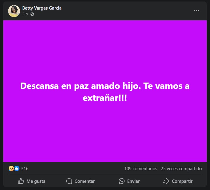 “Descansa en paz amado hijo. Te vamos a extrañar”, escribió, provocando una ola de apoyo y condolencias entre sus seguidores. Su publicación ha logrado más de 300 reacciones en la mencionada red social.