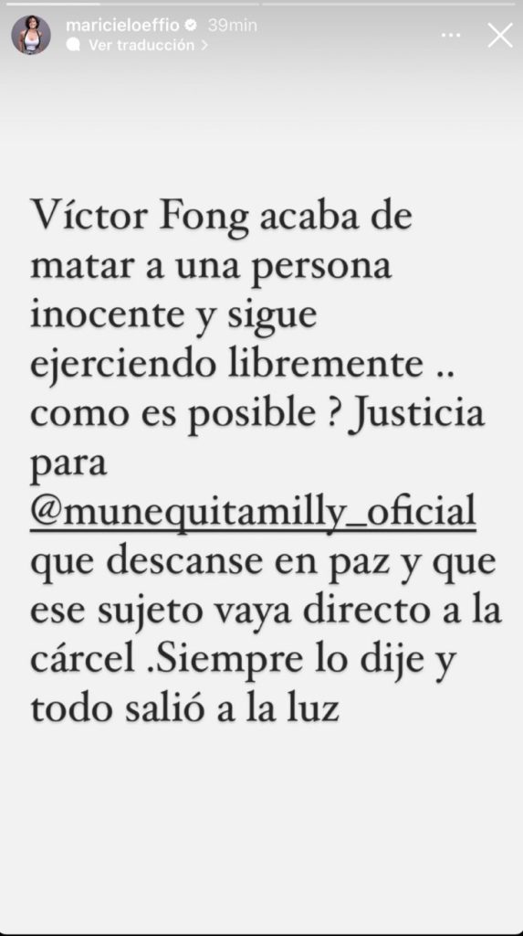 “Victor Fong acaba de matar a una persona inocente y sigue ejerciendo libremente. ¿Cómo es posible? Justicia para Muñequita Milly, que descanse en paz y que ese sujeto vaya directo a la cárcel. Siempre lo dije y todo salió a la luz”, dijo en una publicación a través de sus historias de Instagram.