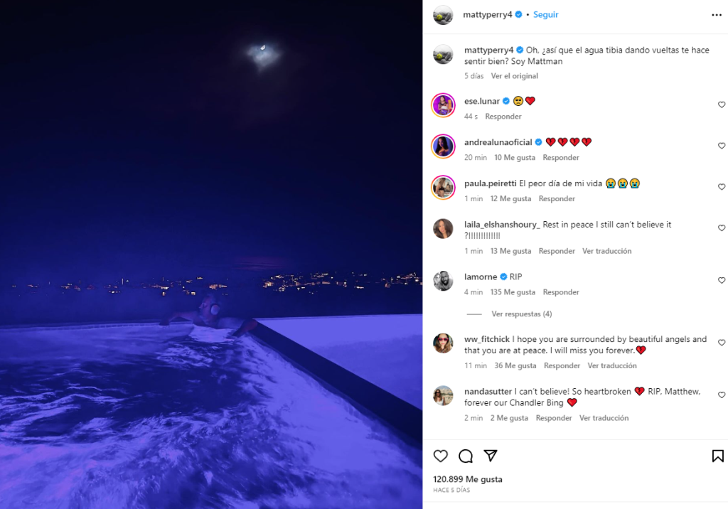 Es justo en ese post donde sus fanáticos han ido a dejarle conmovedores mensajes de despedida. “Estoy tan triste, te echaremos mucho de menos. Tu habilidad para hacer reír a la gente fue un regalo. usted fue un gran humano”, “¡Descanse en paz, señor! ¡Trajiste grandes risas!”, “Descansa en paz Chandler Bing, ¡eres legendario!”, “Uf, me duele el corazón… QEPD”, “Descansa tranquilo. Gracias por tu entretenimiento infinito”, son algunas reacciones de sus fanáticos.