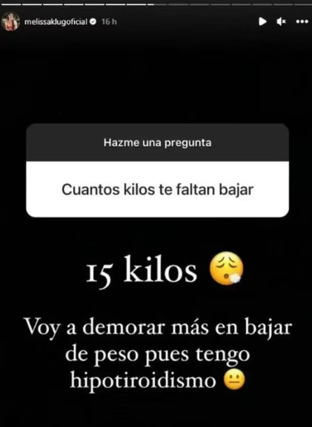 “(Me falta bajar) 15 kilos. Voy a demorar más en bajar de peso, pues tengo hipotiroidismo”, respondió la también madre de los hijos de Jefferson Farfán.