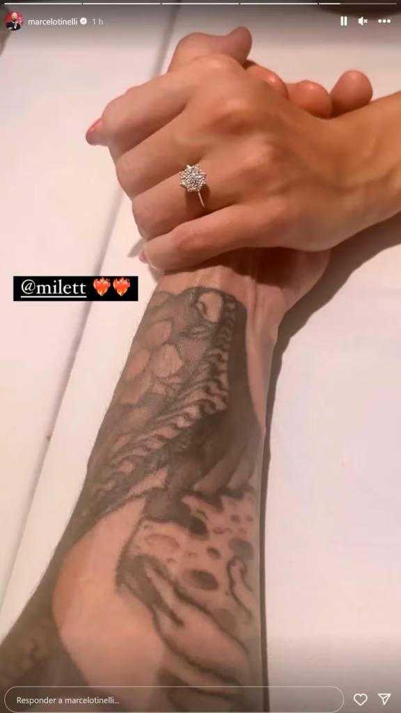 Como descripción, Tinelli etiquetó a su novia y le agregó un par de emojis de corazón. Es un anillo de aparición reciente, ya que en fotos anteriores de la modelo, no aparece, por lo que podemos suponer es un regalo que el conductor le hizo hace poco a la peruana.