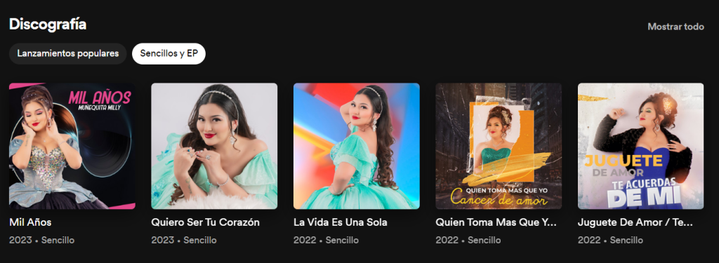 Según la plataforma de Spotify, sus últimos sencillos de la Muñequita Milly fueron Mil años y Quiero ser tu corazón, temas que salieron a la luz en el 2023. Sin embargo, hay otros temas como La vida es una sola, éxito que obtuvo varias reproducciones en el año 2022.