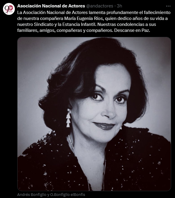 “La Asociación Nacional de Actores lamenta profundamente el fallecimiento de nuestra compañera María Eugenia Ríos, quien dedico años de su vida a nuestro Sindicato y la Estancia Infantil. Nuestras condolencias a sus familiares, amigos, compañeras y compañeros. Descanse en Paz”, fue el mensaje difundido por la Asociación Nacional de Actores en X.