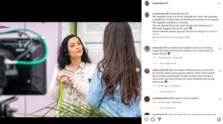 Asimismo, la actriz agregó: “Hoy me despido de tu piel, pero estarás para siempre en mi Mercedes Eugenia Gómez de López. Espero haberles sacado algunas sonrisas con ella jiji”. En su lugar, la actriz Ximena Díaz ingresará a la novela de Latina, quien también le dio su apoyo a Salas.