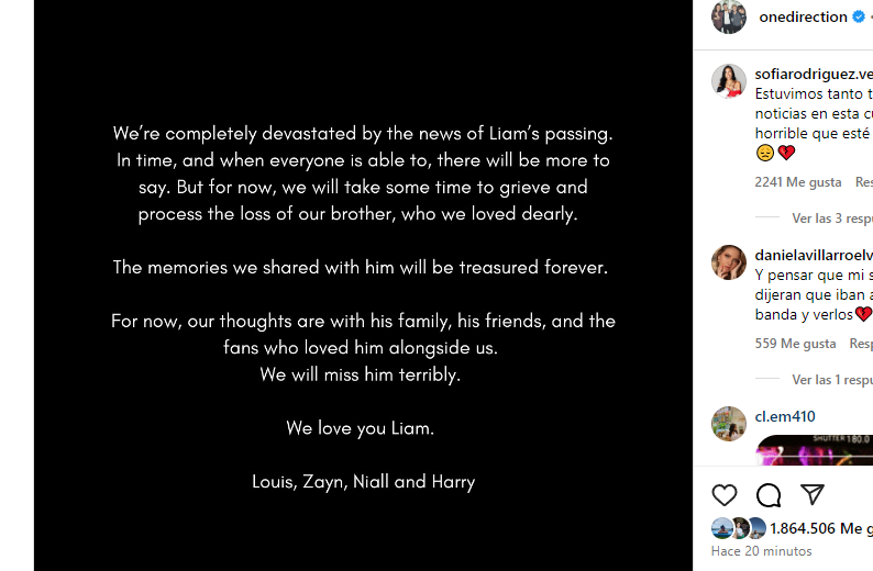 Mediante un breve comunicado, publicado en las redes sociales de la banda, sus exmiembros dicen estar “completamente devastados” por la repentina partida de su excompañero y amigo, por lo que mandaron sus condolencias a los familiares, amigos y fans de LiamPayne.
