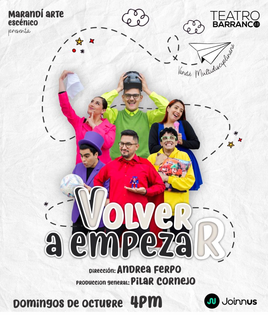 Todos los domingos de octubre, a las 4:00 pm, se presentará la obra “Volver a empezar”, en el Teatro Barranco (Av. Grau 701, Barranco). Dirigido por Andrea Ferpo, es un espectáculo que combina diferentes disciplinas artísticas.