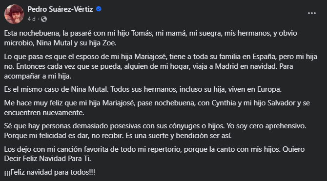 La esposa de Pedro Suárez Vértiz, Cynthia Martínez, se encontraba en España cuando recibió la noticia de que el ícono del rock peruano había fallecido. Viajó para pasar las fiestas navideñas junto a su hija María José Suárez Vértiz.