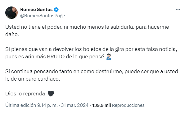 Sin embargo, en la cuenta oficial del cantante en X una publicación trató de poner paños fríos a las noticias. “Usted no tiene el poder, ni mucho menos la sabiduría, para hacerme daño. Si piensa que van a devolver los boletos de la gira por esta falsa noticia, pues es aún más bruto de lo que pensé. Si continua pensando tanto en como destruirme, puede ser que a usted le de un paro cardiaco. Dios lo reprenda”, se lee.