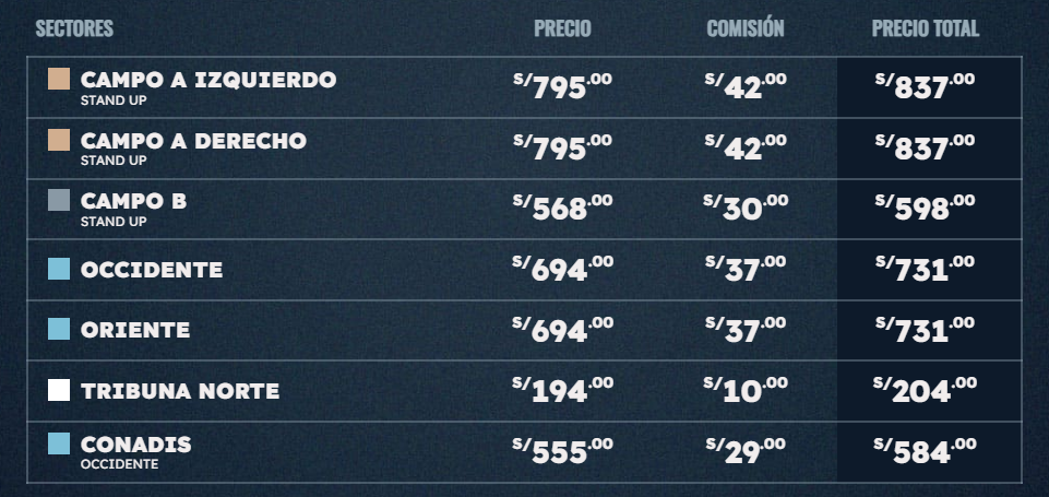 Los precios de las entradas para el concierto de Shakira van desde los 204 soles en tribuna norte y el boleto más caro cuesta 837 soles. Cabe mencionar que para este concierto, la comisión de la ticketera se pagará aparte del boleto, por eso el incremento en el precio de las entradas.