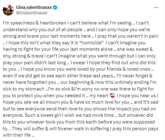 “Estoy sin palabras y con el corazón roto. No puedo creer lo que estoy viendo.No puedo entender por qué tú entre todas las personas y sólo puedo esperar que seamos fuertes y valientes en tus últimos momentos aquí. Rezo para que no hayas sentido dolor“, escribió Gina Valentine, su colega en el mundo del cine para adultos, a través de su cuenta de ‘X’.